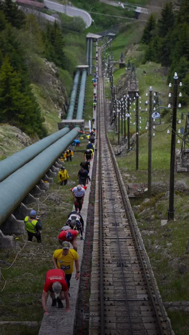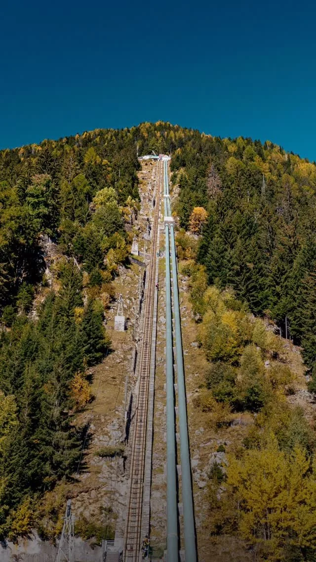 I 4’261 gradini del tracciato seguono le rotaie della funicolare e le condotte forzate che portano alla centrale idroelettrica. La pendenza media e del 61% con una pendenza massima dell’89%!